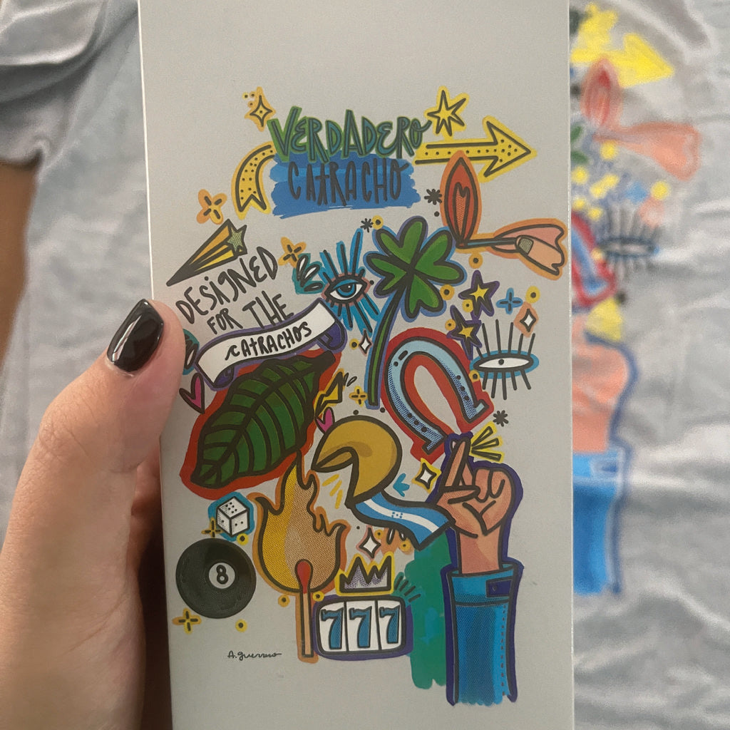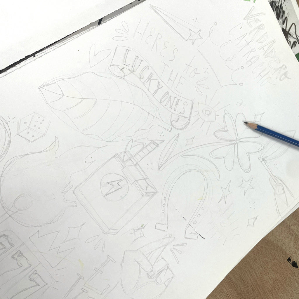 Mi inspiración se encuentra en elementos que simbolizan la buena suerte. Quise destacadar la estrella de cinco puntas, que representa la verdad, así como el trébol de cuatro hojas, que simboliza la esperanza, la fe, el amor y la suerte. La herradura, al igual que la galleta de la fortuna, la bola y otros símbolos, también se han incluido en la ilustración como representaciones de la suerte.