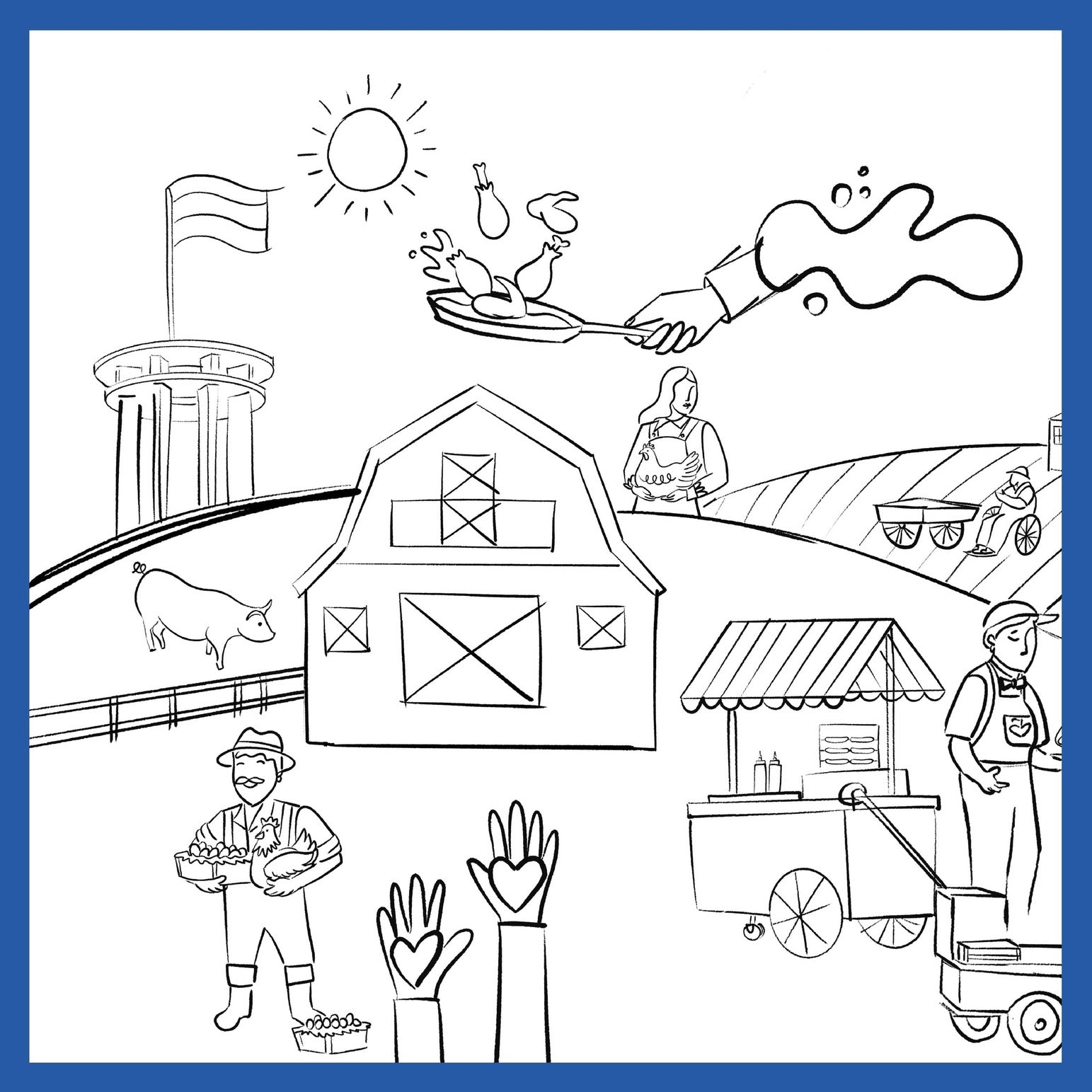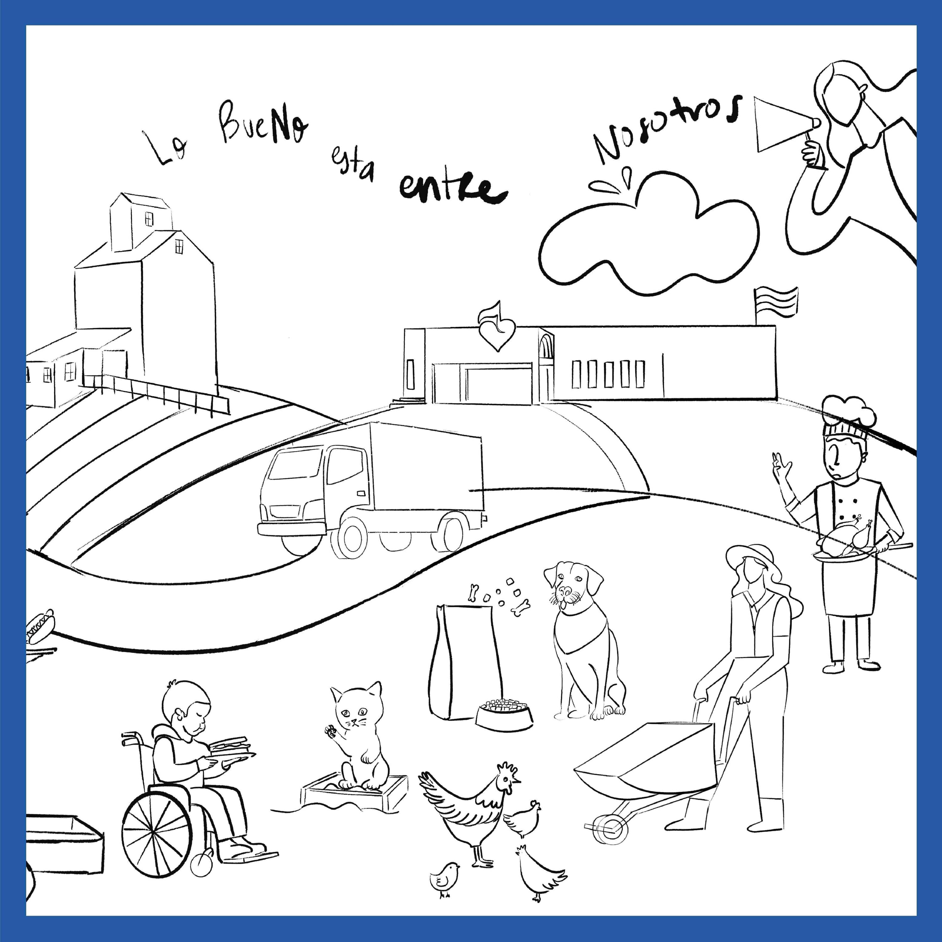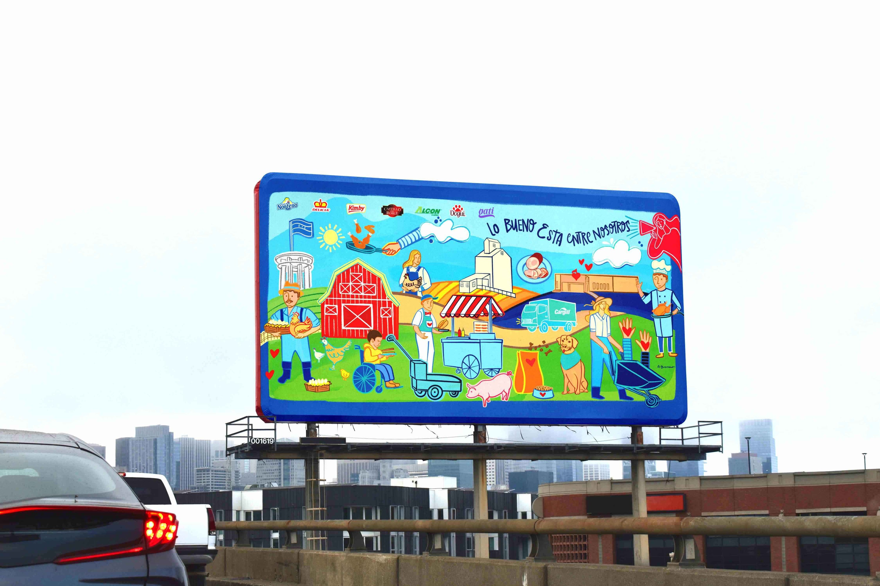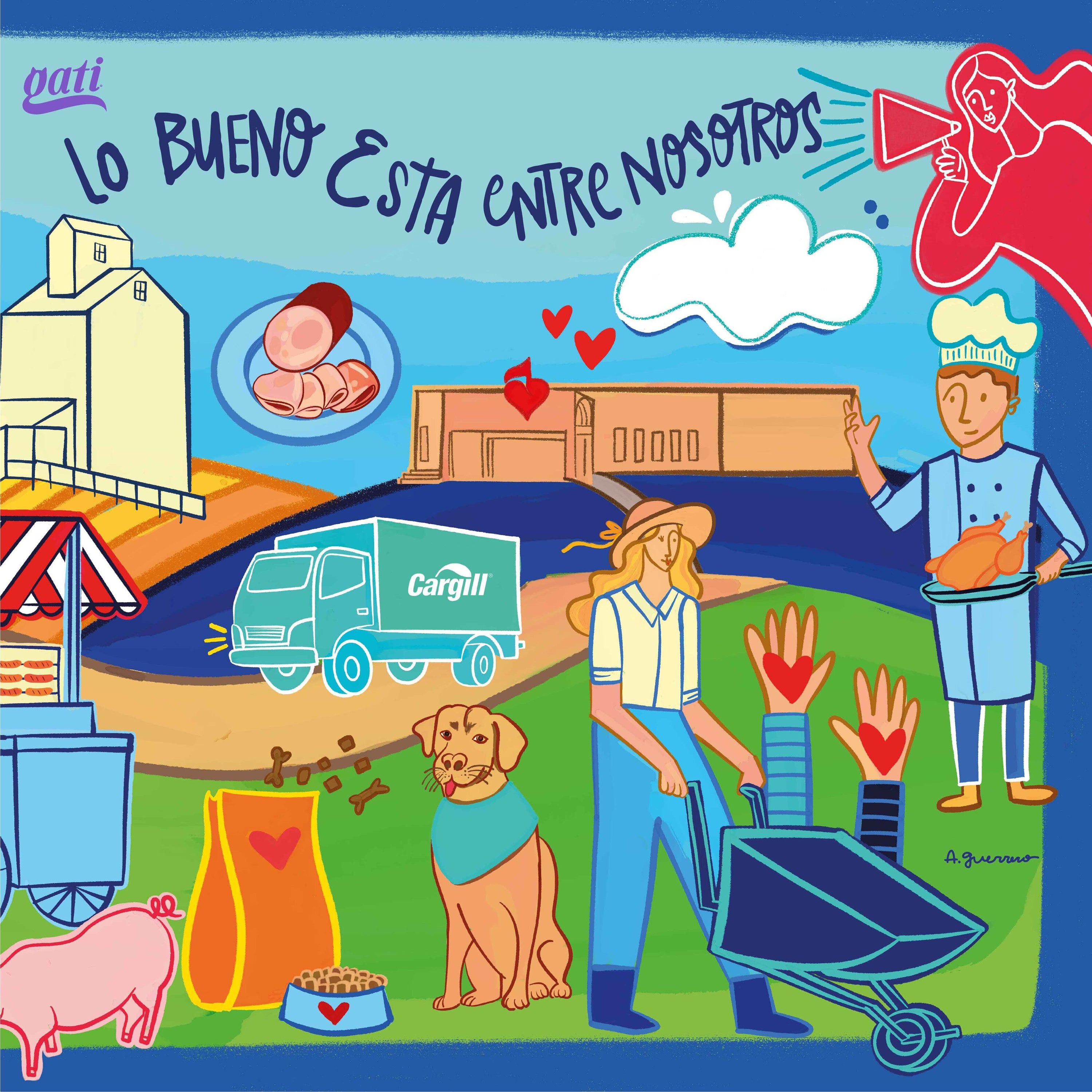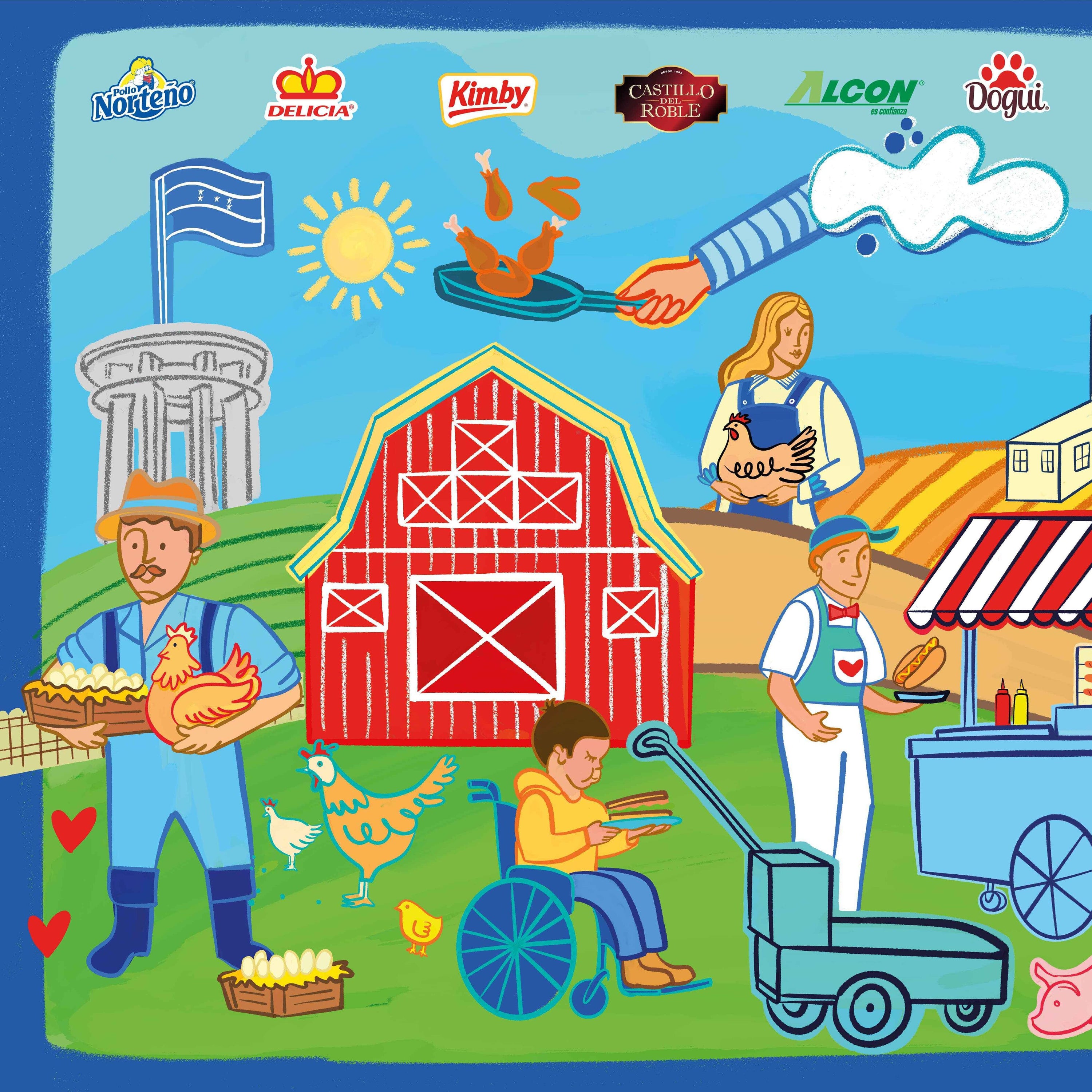 En la creación de la ilustración, se utilizó una paleta de colores vibrante y alegre para resaltar cada elemento representativo de Cargil, capturando características distintivas como el edificio de Teletón, gallinas, el icónico camión, la granja, entre otros. Se incorporó la frase "Lo bueno está entre nosotros", destacando la esencia de Pollo Norteño.