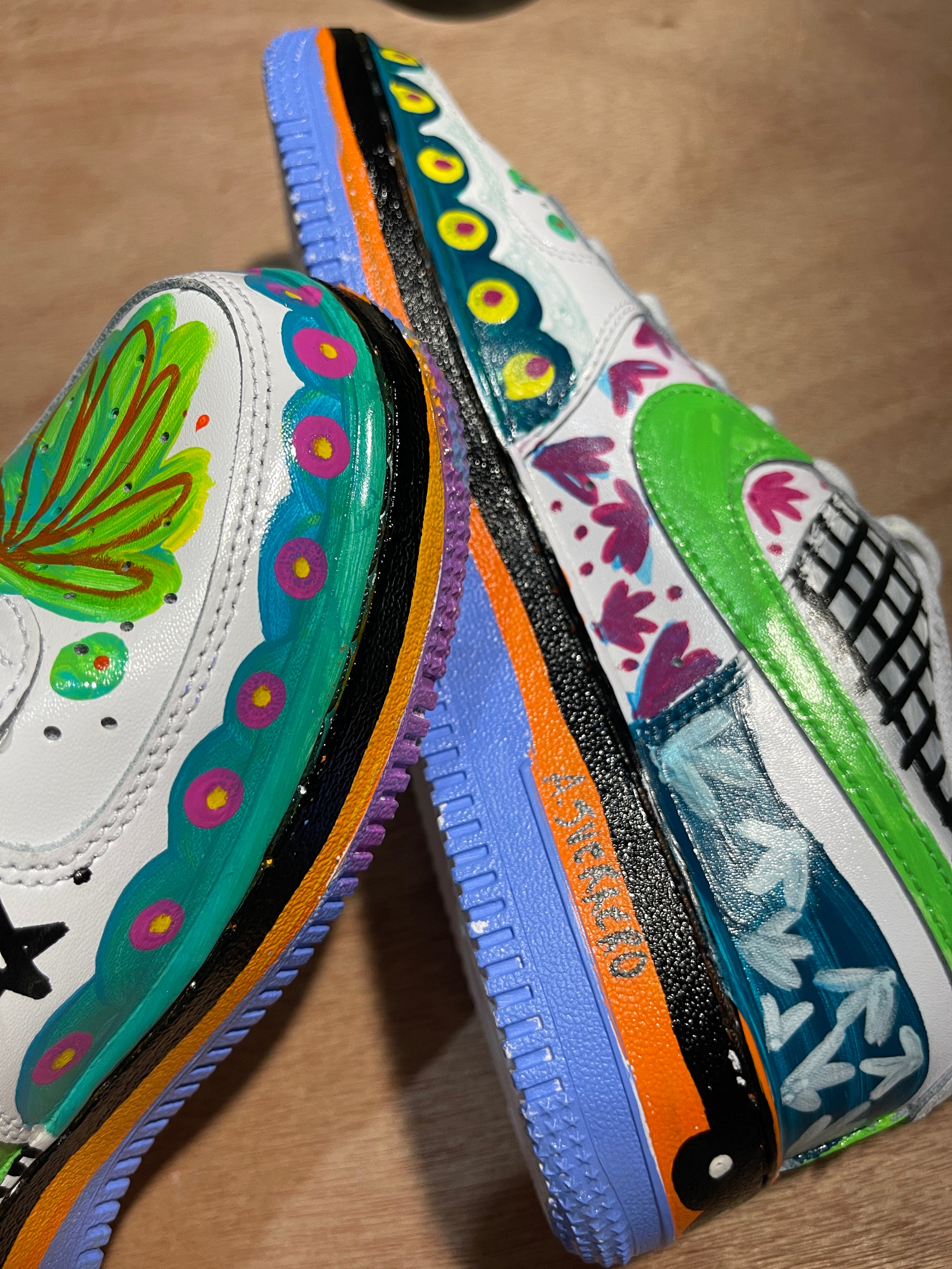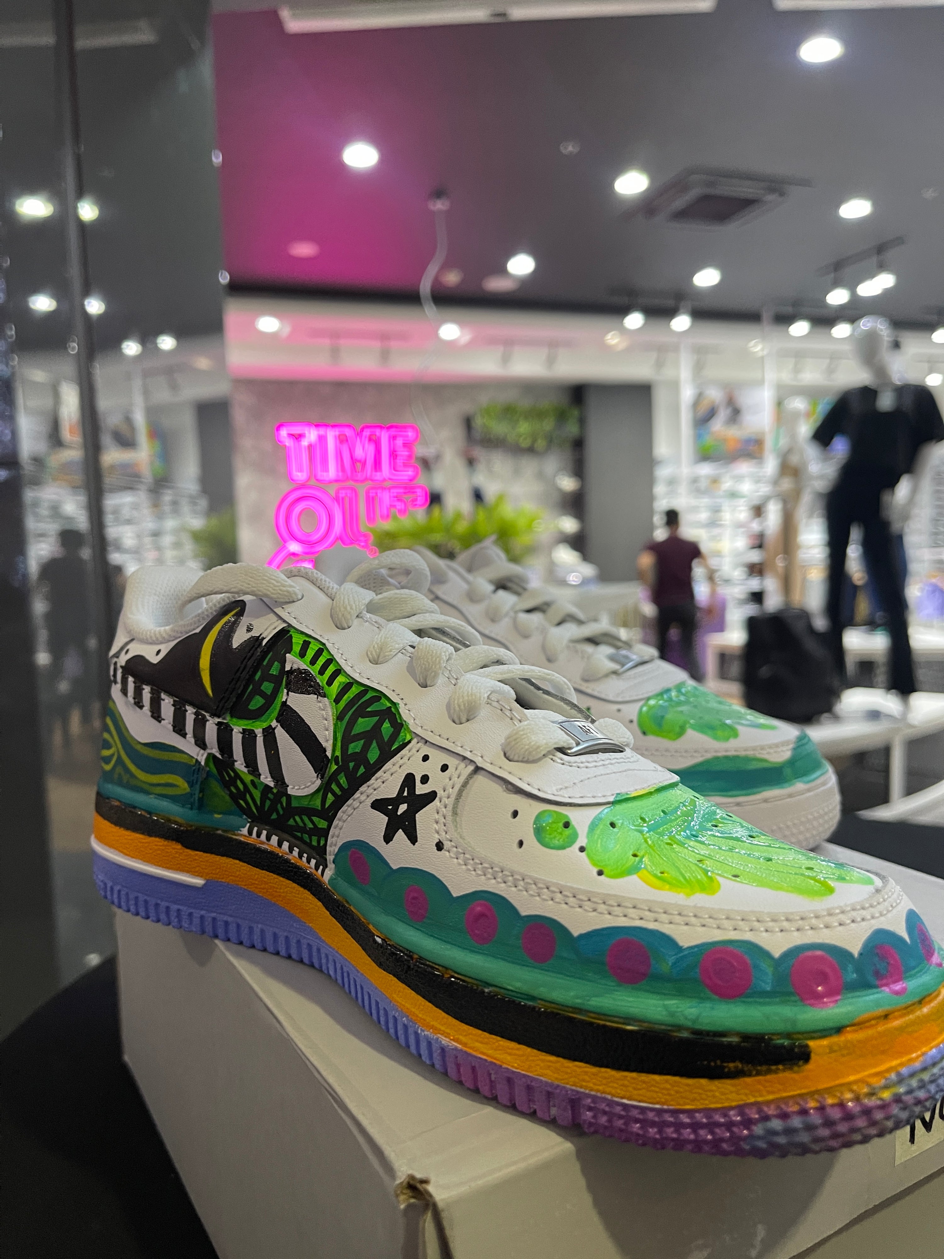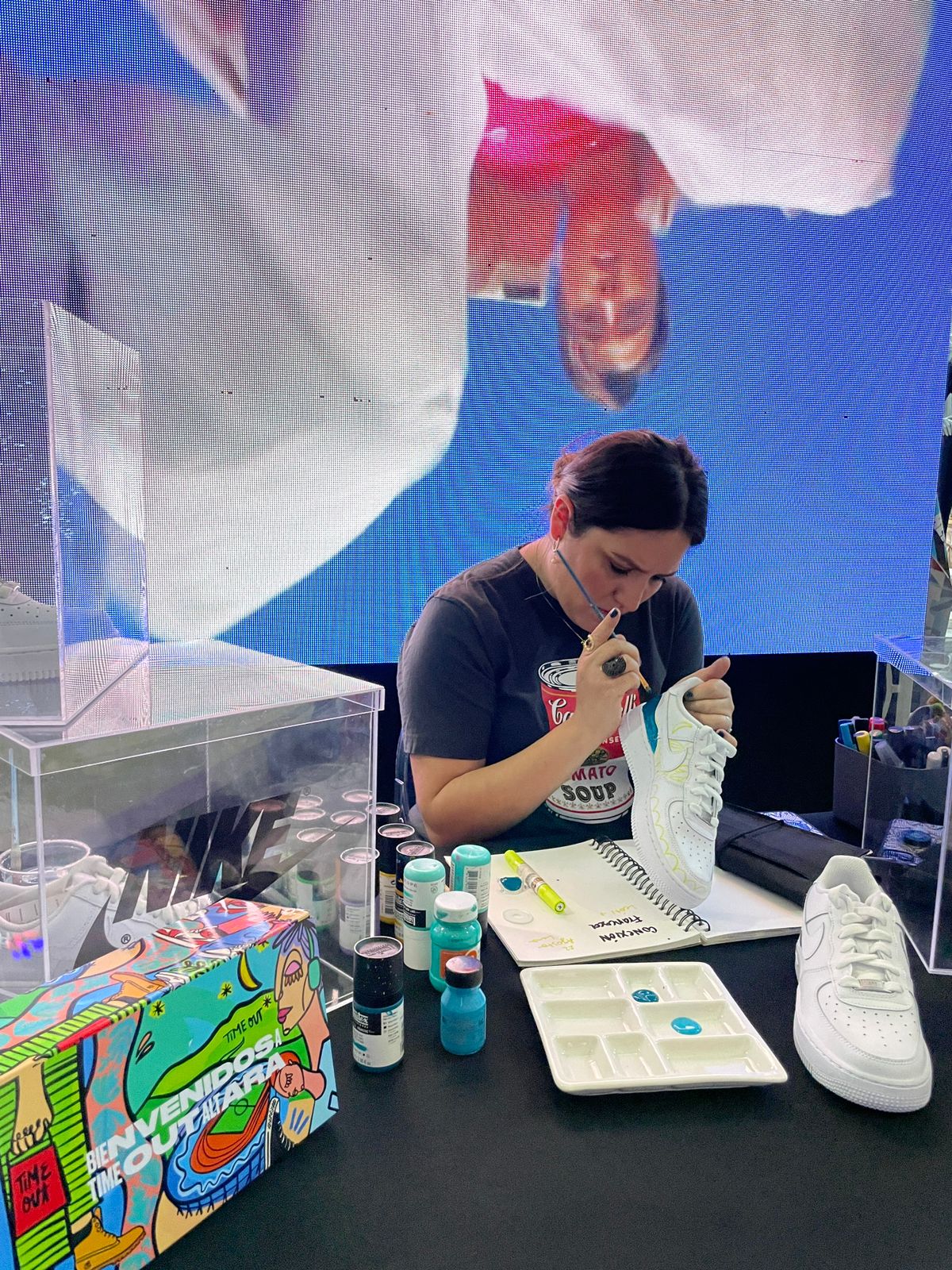 Trabajamos en vivo con Time Out, en esta ocasión pinté unos Air Force 1 que fueron rifados a una influencer, me encantó que me dieran la libertad de crear lo que quisiera con los tennis, y la inspiración llegó rápidamente. El diseño fue surgiendo en el momento, con las formas y figuras características de mi marca, patrones en colores marcados en blanco y negro, fue bien bonito ver cómo el diseño tomaba forma en los tennis y me encantó el resultado final y aún mas ver la reacción de la influencer al recibirlo. Saber que alguien más los disfrutará tanto como yo disfruté creándolos, es una de las razones por la que amo mi trabajo.