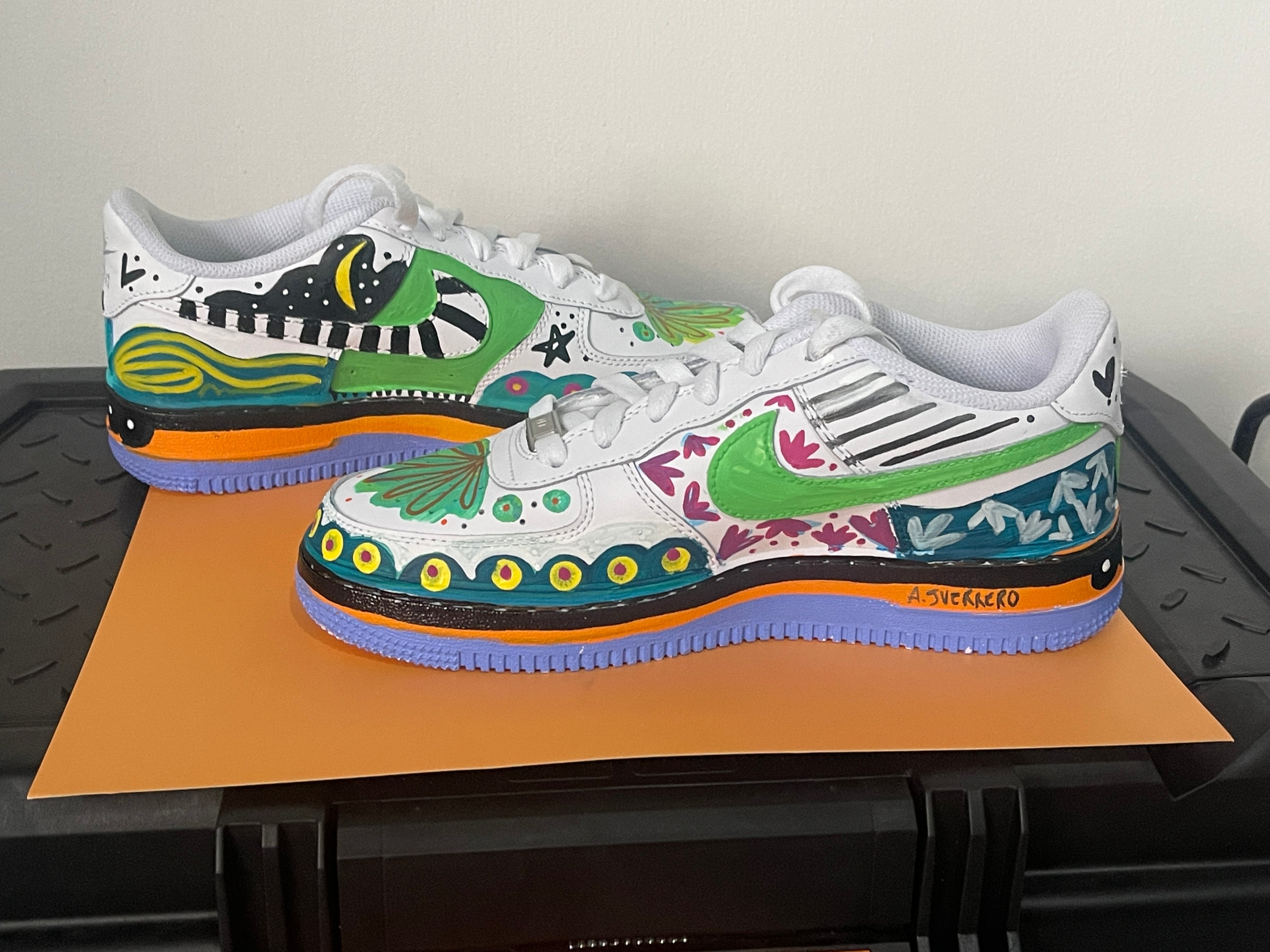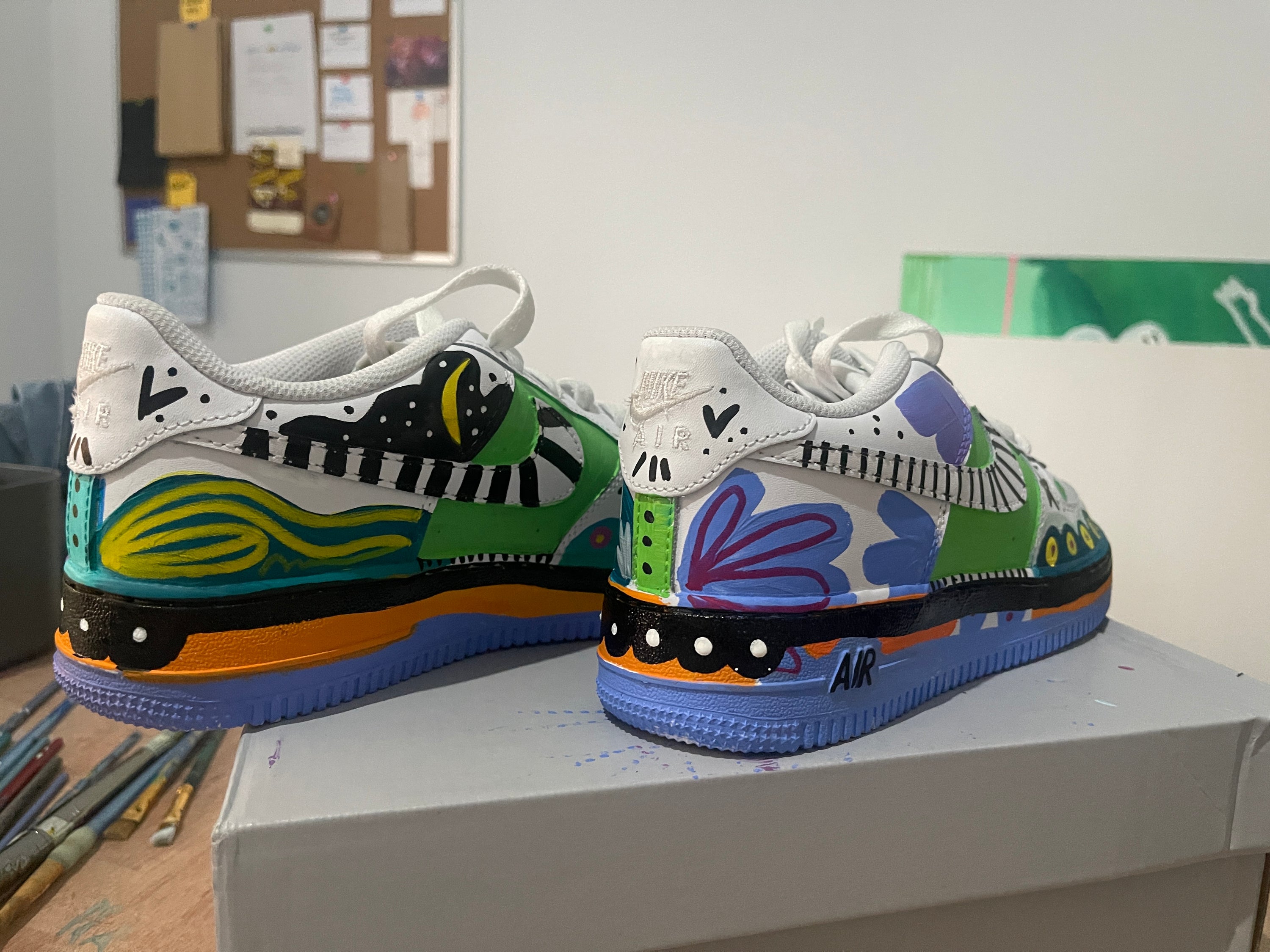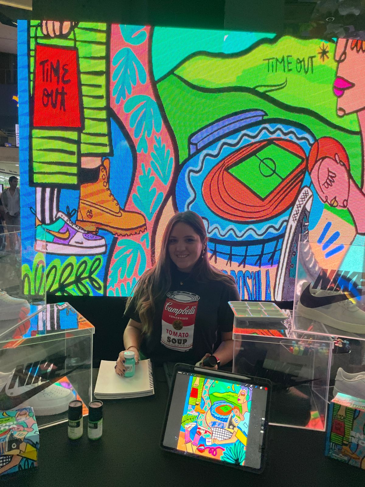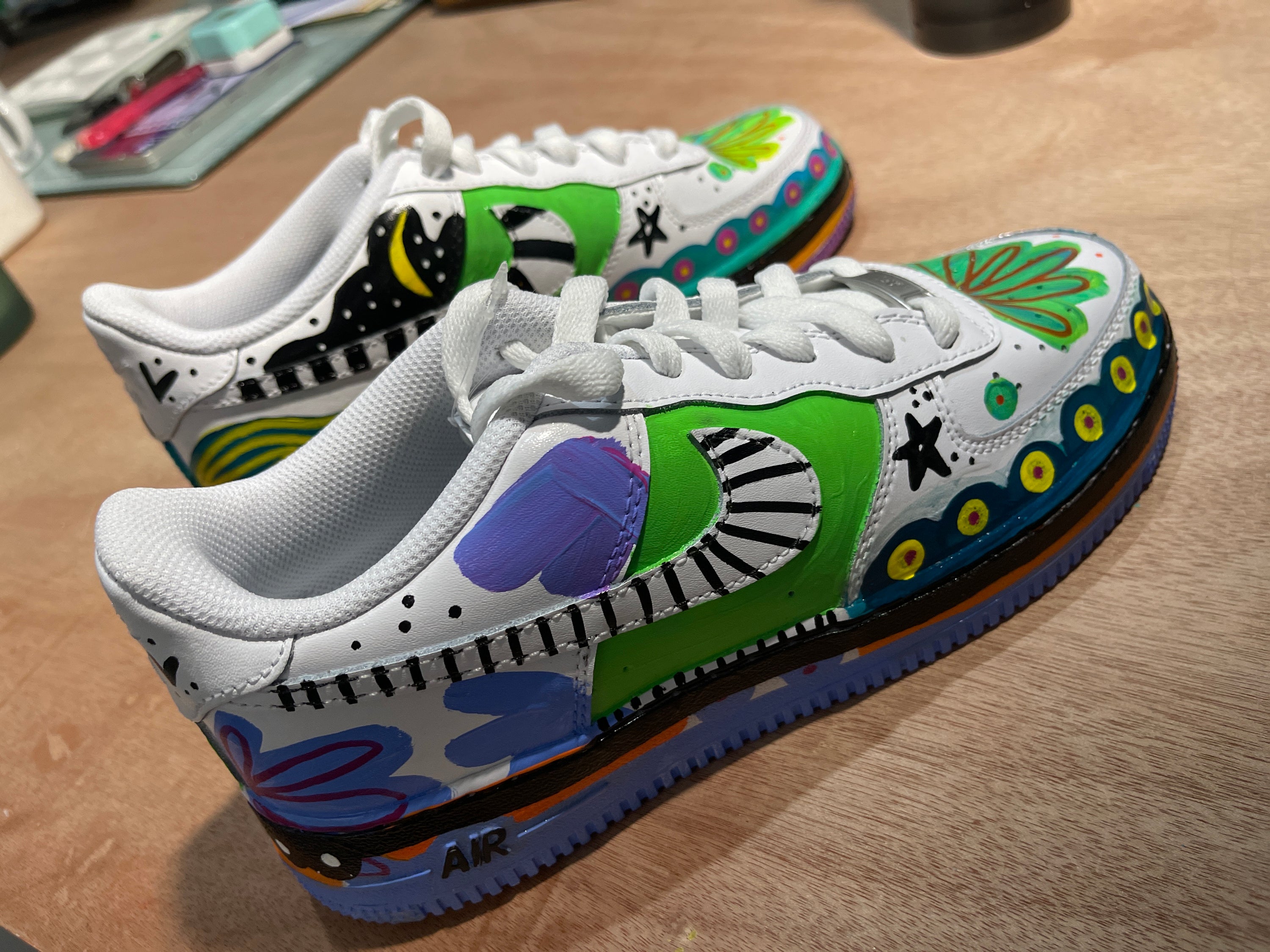 Trabajamos en vivo con Time Out, en esta ocasión pinté unos Air Force 1 que fueron rifados a una influencer, me encantó que me dieran la libertad de crear lo que quisiera con los tennis, y la inspiración llegó rápidamente. El diseño fue surgiendo en el momento, con las formas y figuras características de mi marca, patrones en colores marcados en blanco y negro, fue bien bonito ver cómo el diseño tomaba forma en los tennis y me encantó el resultado final y aún mas ver la reacción de la influencer al recibirlo. Saber que alguien más los disfrutará tanto como yo disfruté creándolos, es una de las razones por la que amo mi trabajo.
